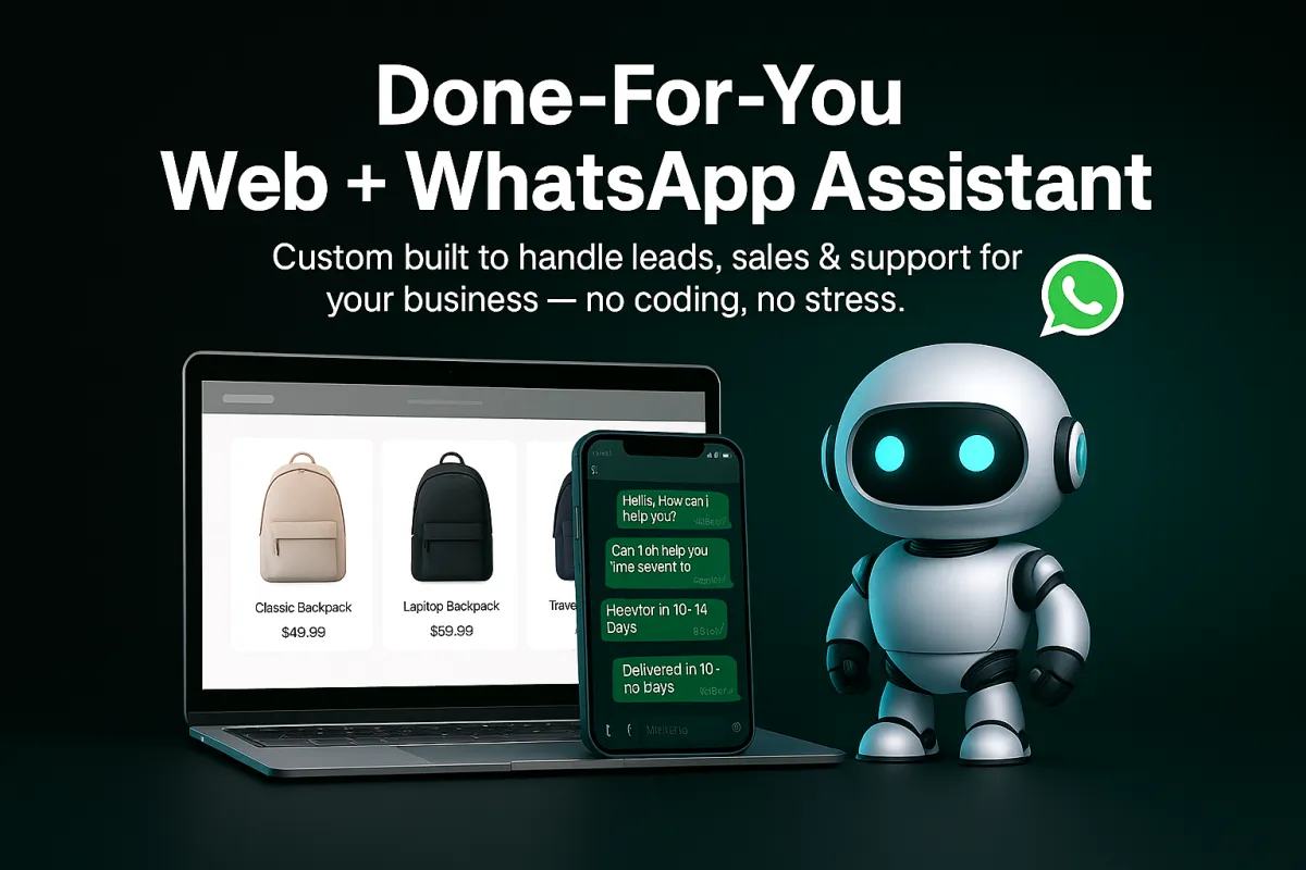 Your Assistant starts converting leads, answering questions, and closing sales from both your website and WhatsApp. No software confusion. No maintenance. Just instant automation that grows your business.