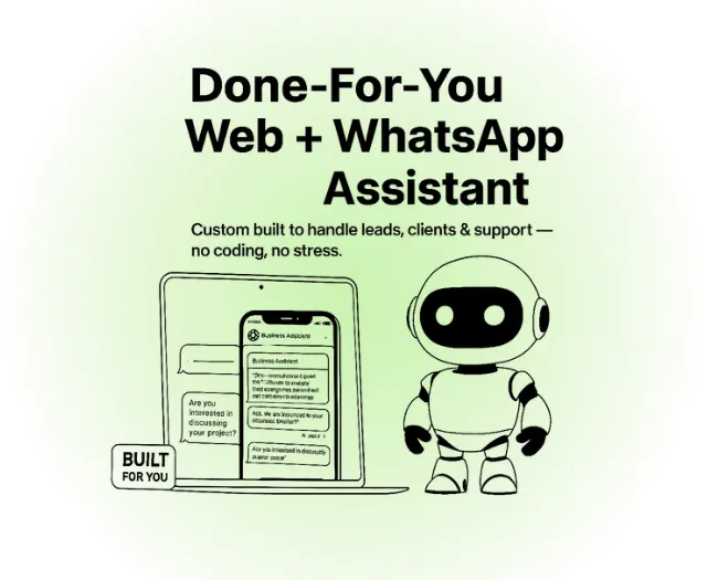 ✅ Done-For-You Web + WhatsApp Business Assistant — a complete automation system that greets visitors, captures leads, replies instantly, and follows up 24/7.